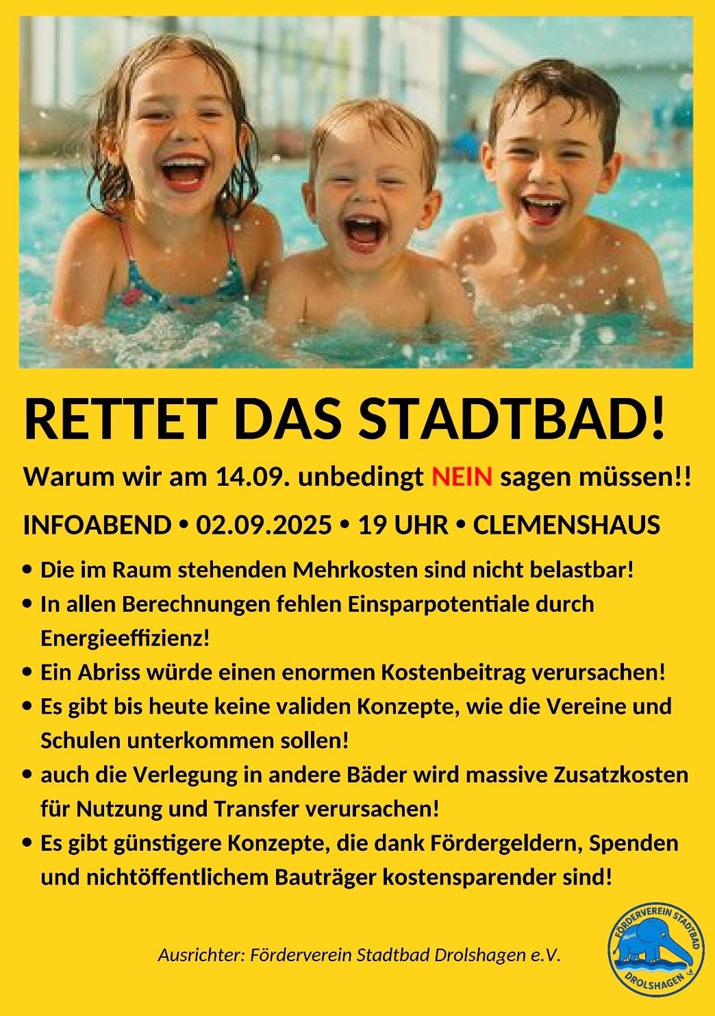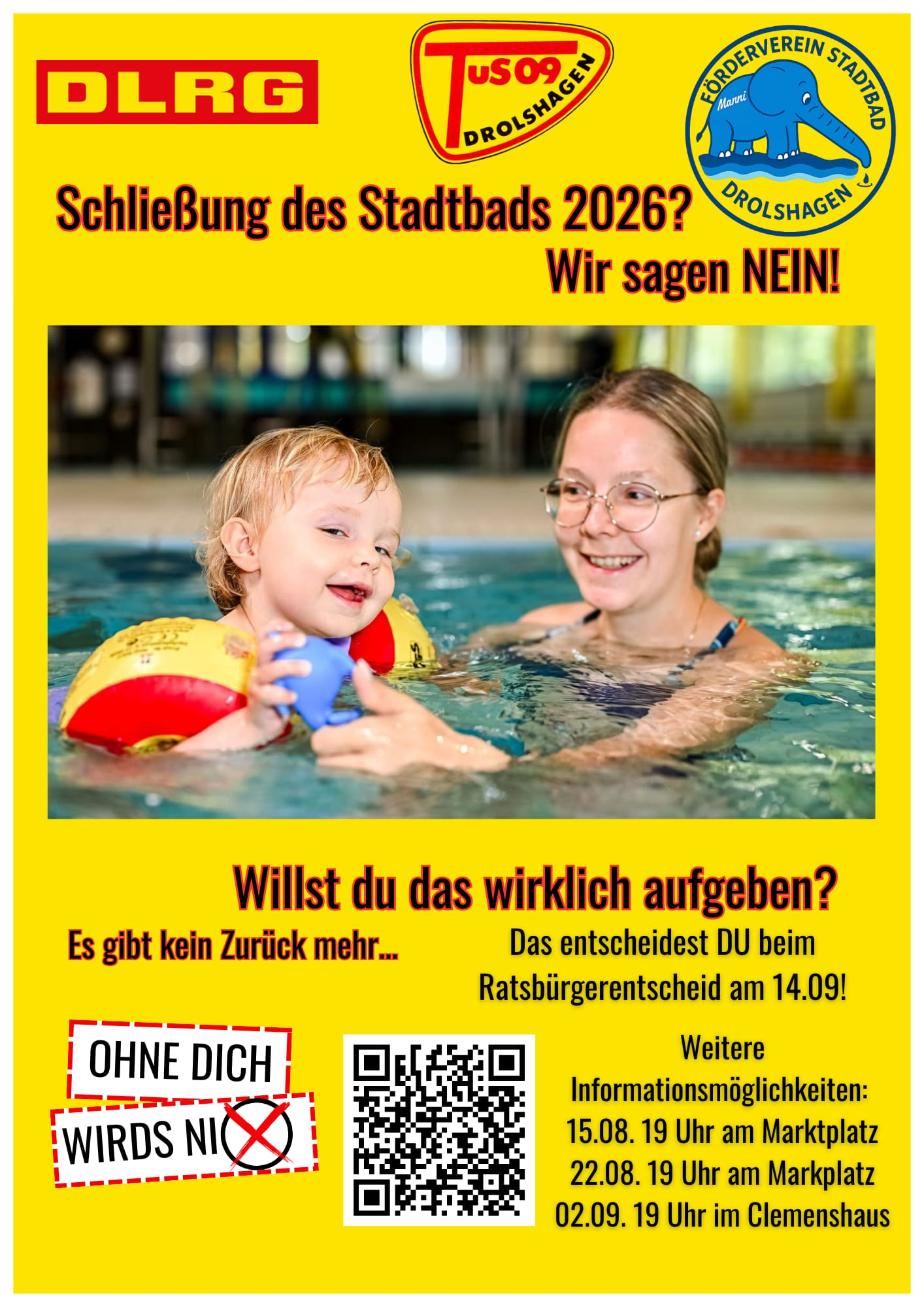WIR HABEN ES GESCHAFFT !!!Beim Bürgerentscheid am heutigen Sonntag haben die Bürger die Frage "Soll das Stadtbad in Drolshagen ab 01.01.2026 dauerhaft geschlossen werden?" mit einer klaren Mehrheit von 65,33% mit NEIN beantwortet.
